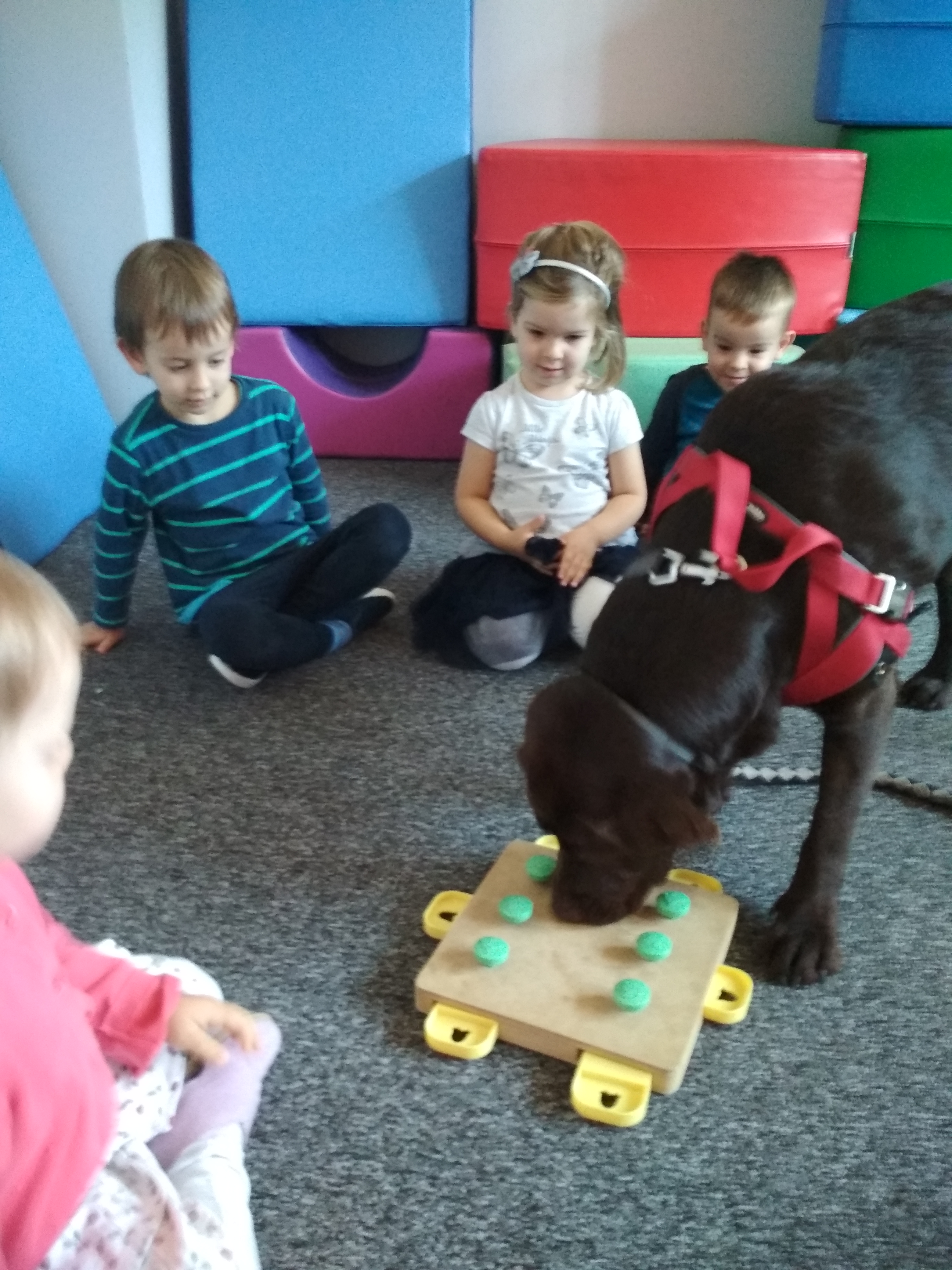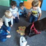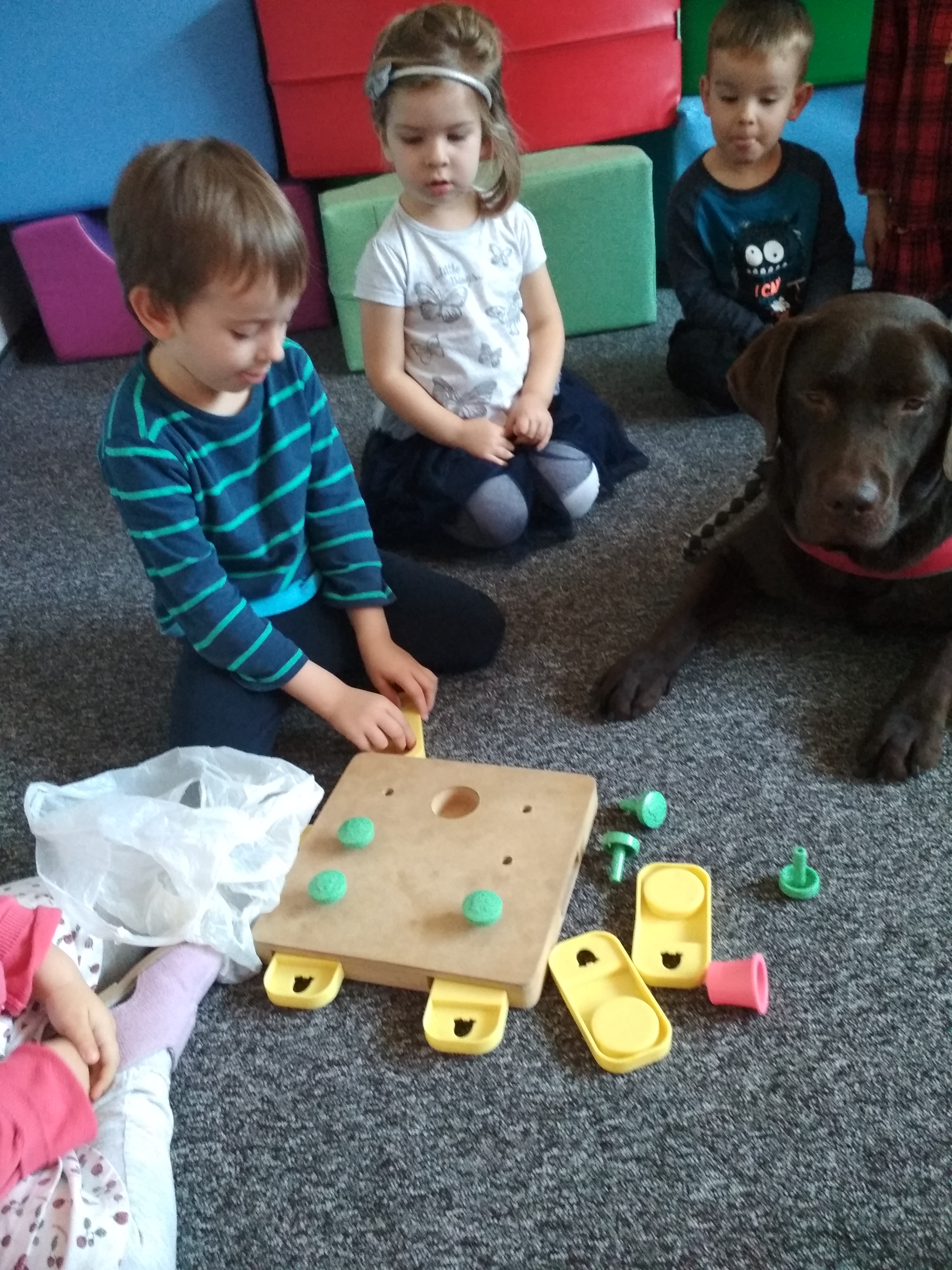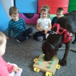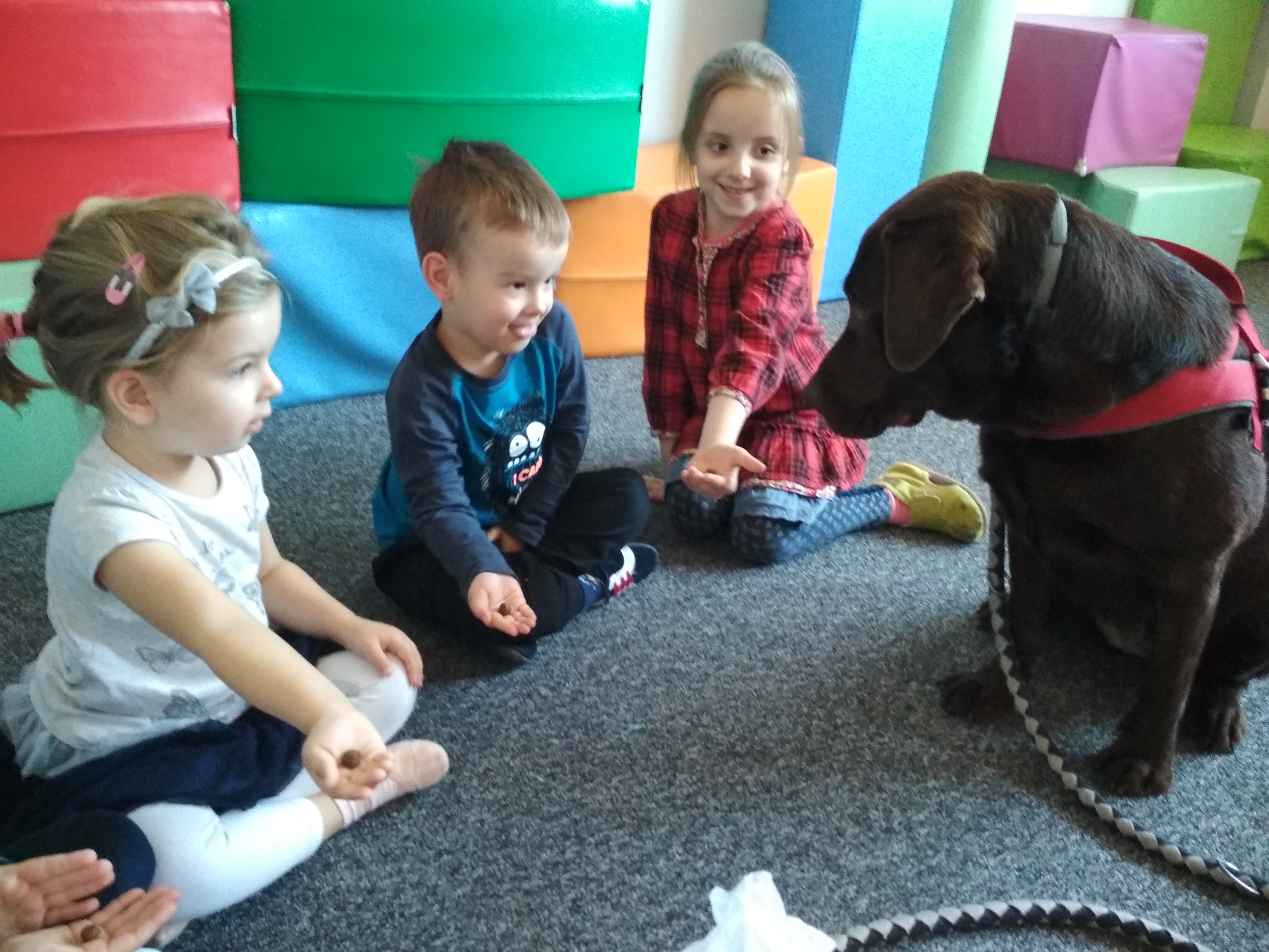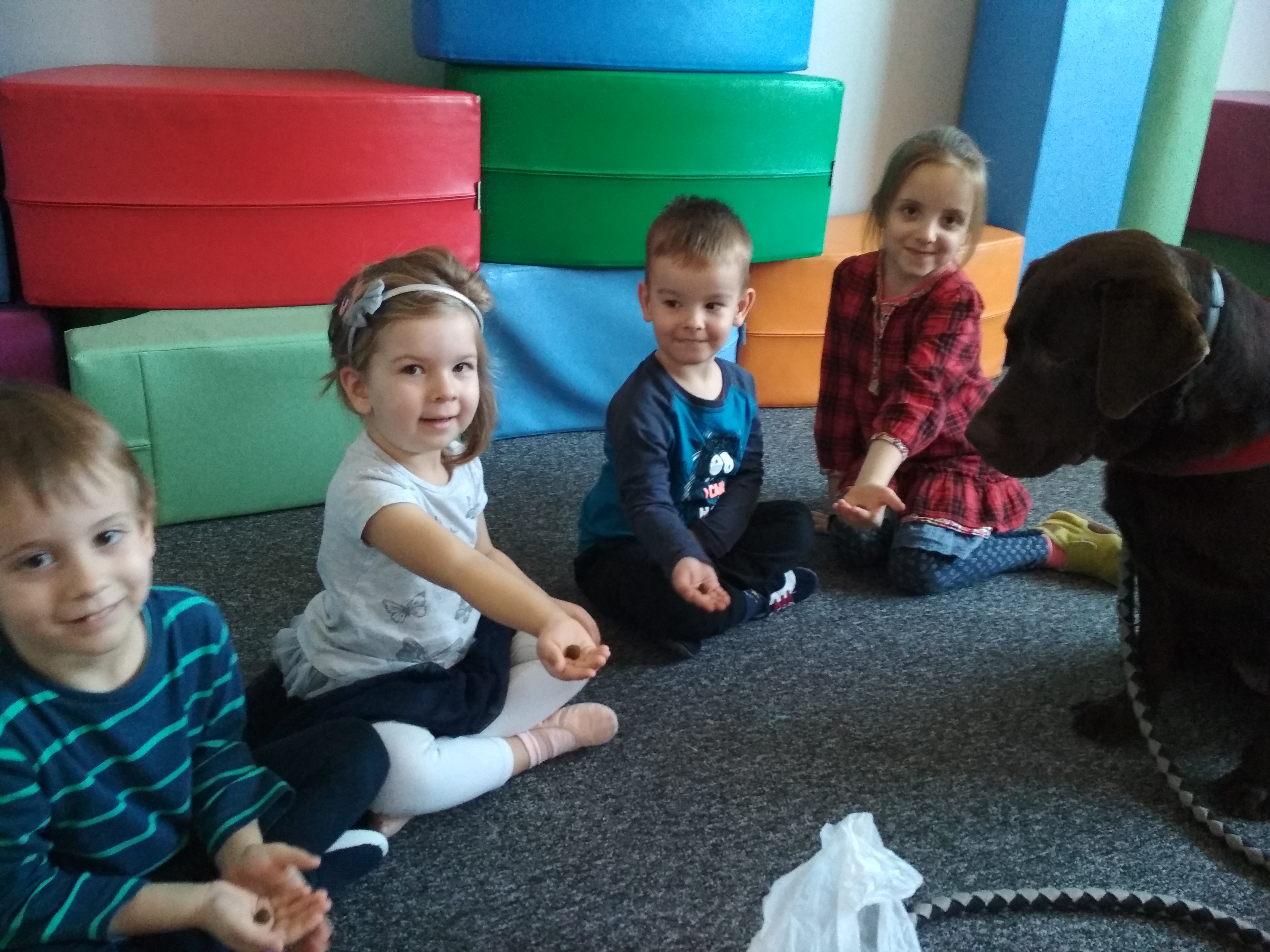 Podczas zajęć dzieci w wieku od 3 do 6 lat oswajały się z obecnością psa (całkiem dużego). Jak to zwykle bywa przy tego typu zajęciach, Bona została wygłaskana, nakarmiona oraz wspólnie z dzieciakami grała w psią „grę planszową”. Zabawa była przednia!
