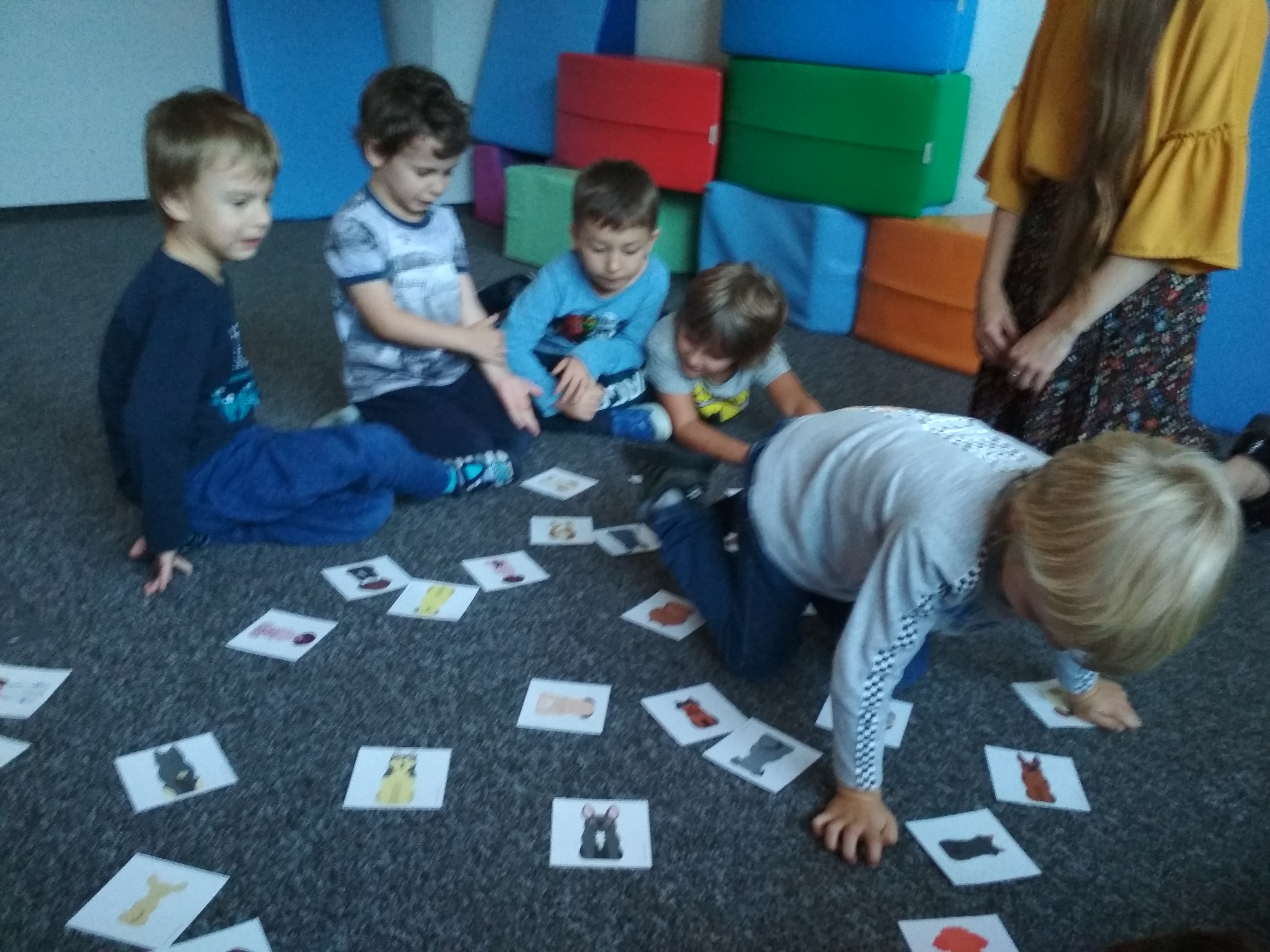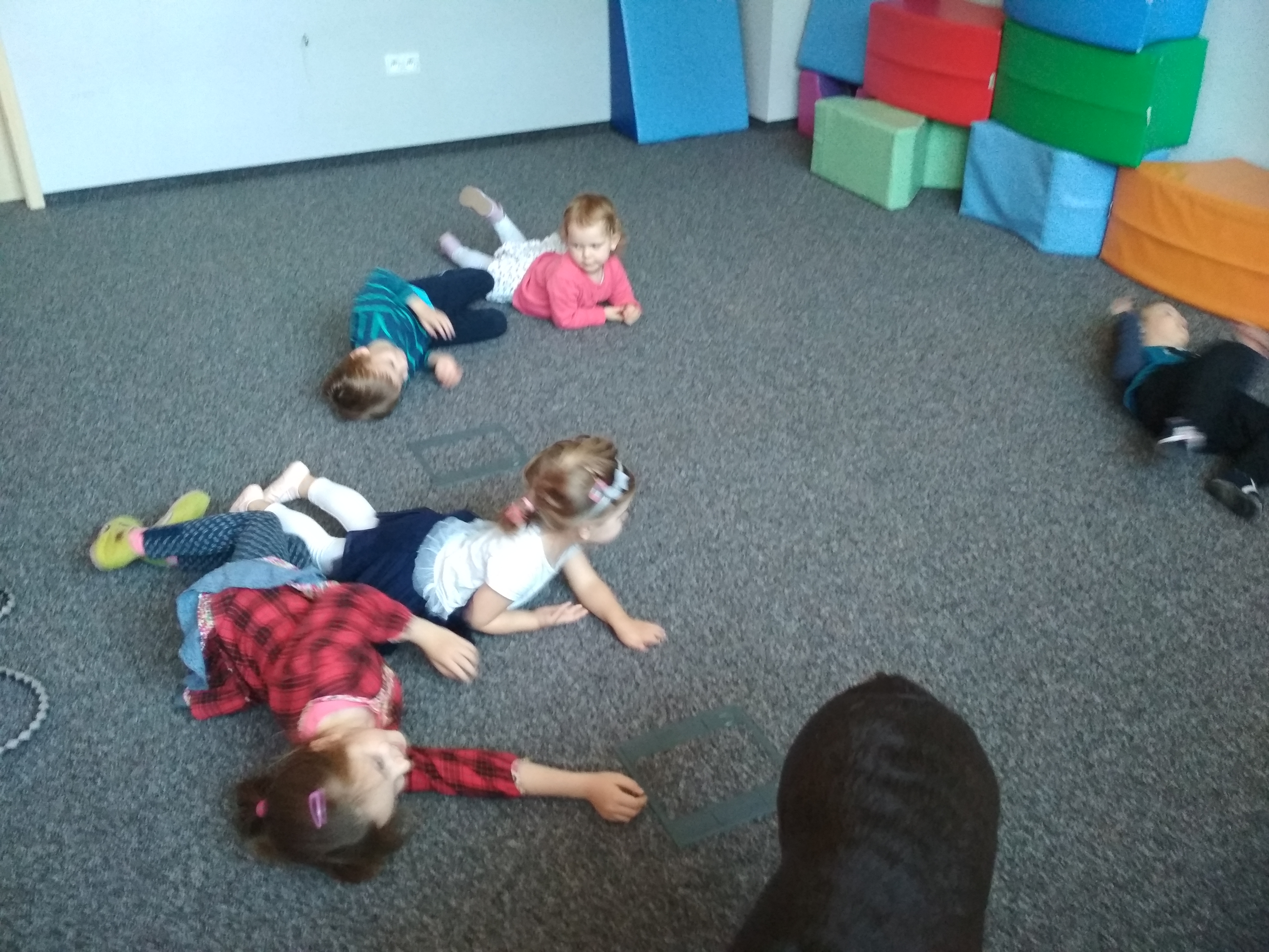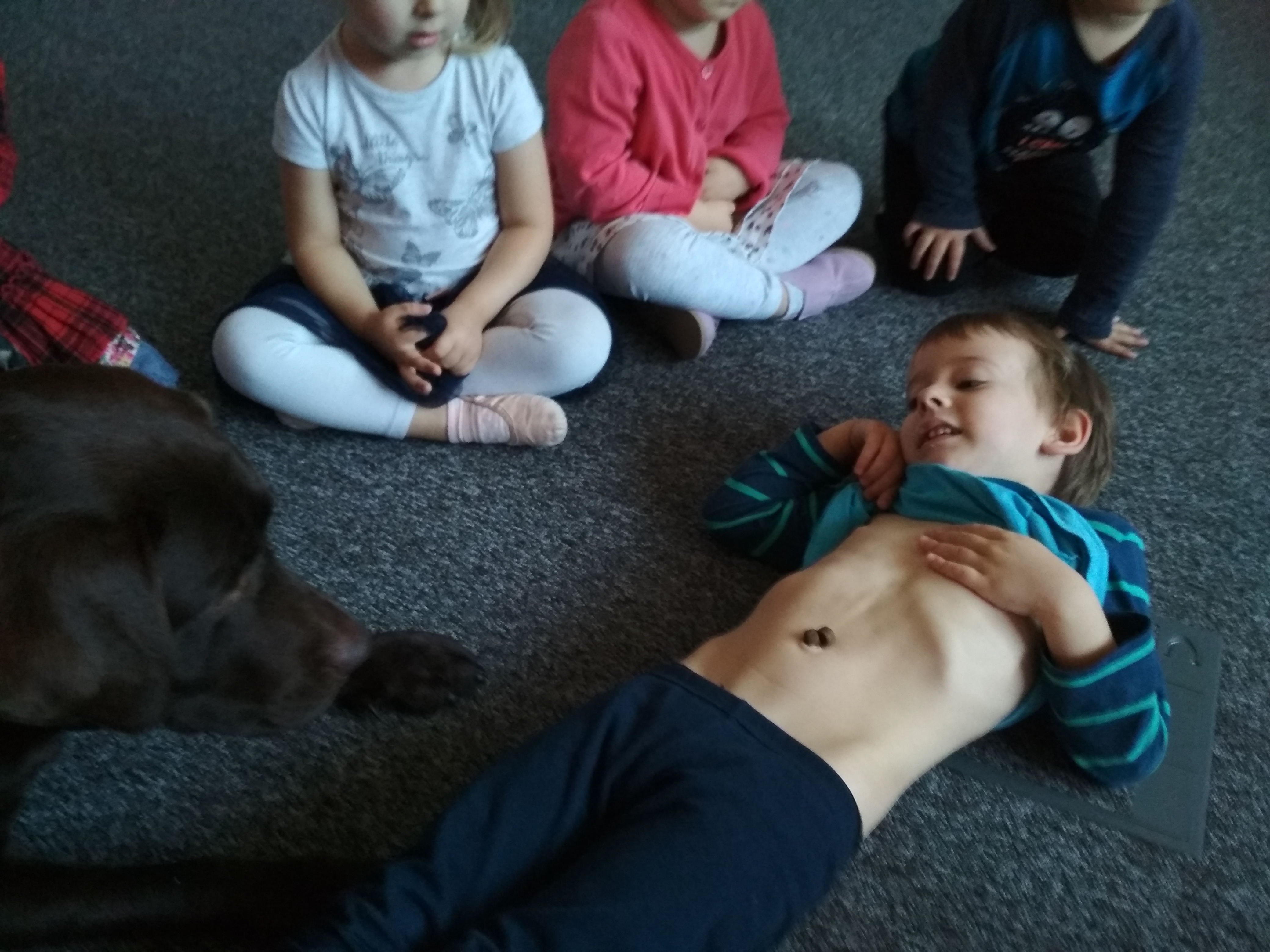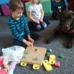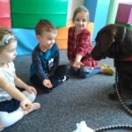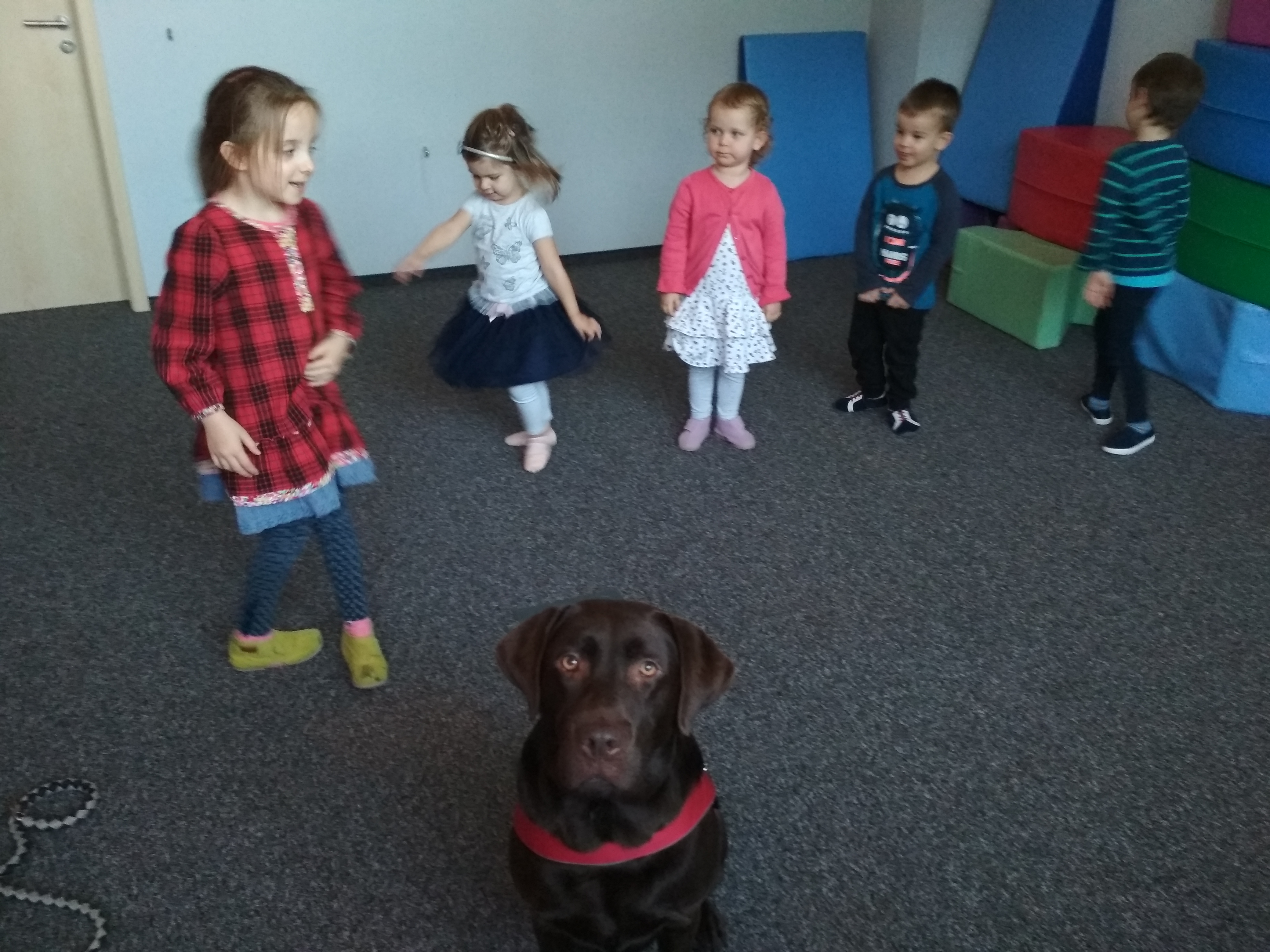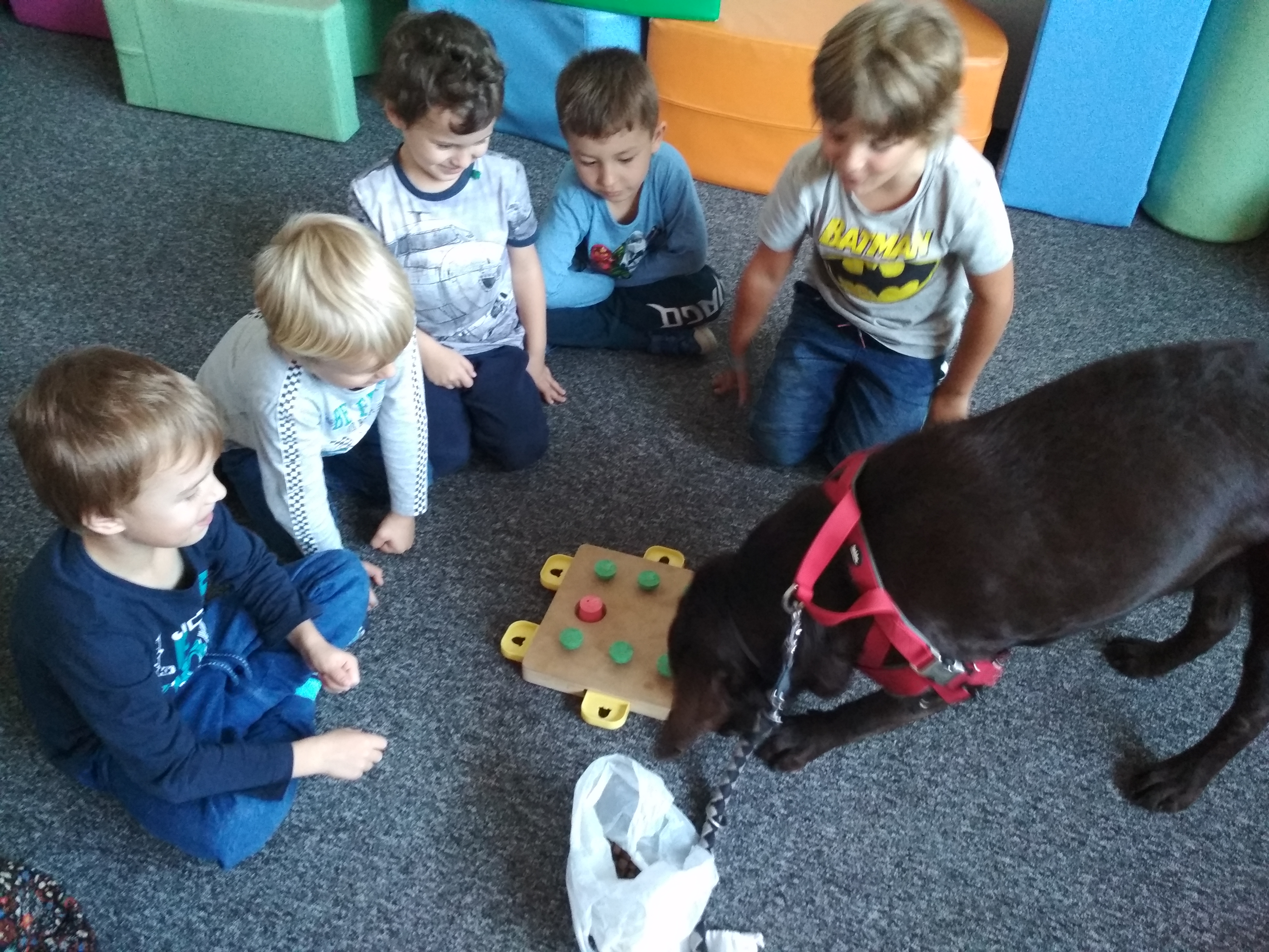 Podczas zajęć dzieci w wieku od 3 do 6 lat oswajały się z obecnością psa (całkiem dużego). Jak to zwykle bywa przy tego typu zajęciach, Bona została wygłaskana, nakarmiona oraz wspólnie z dzieciakami grała w psią „grę planszową”. Zabawa była przednia!