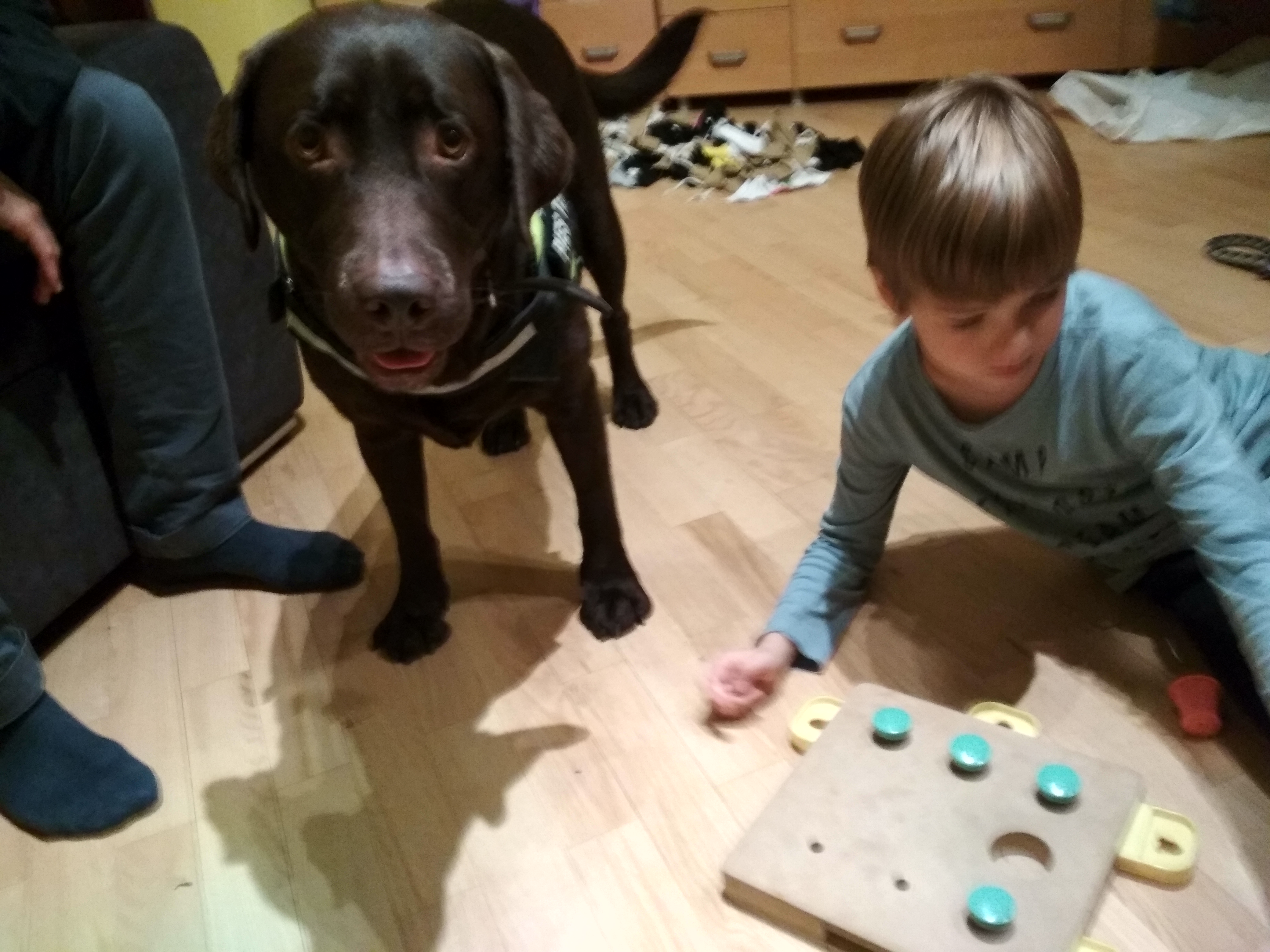 Wspólnie z Bona grają w „planszówki”, piłkę, chowanie smaczków. Bona jest głaskana, przytulana, karmiona itp. Mamy nadzieję, że nasza czekoladka pomoże osiągnąć sukces w 100 %!!.