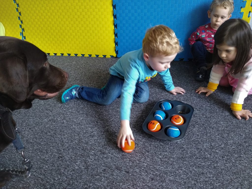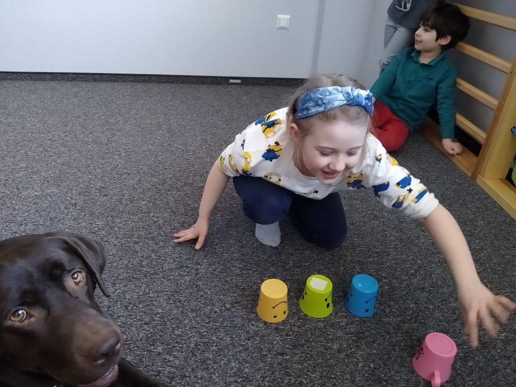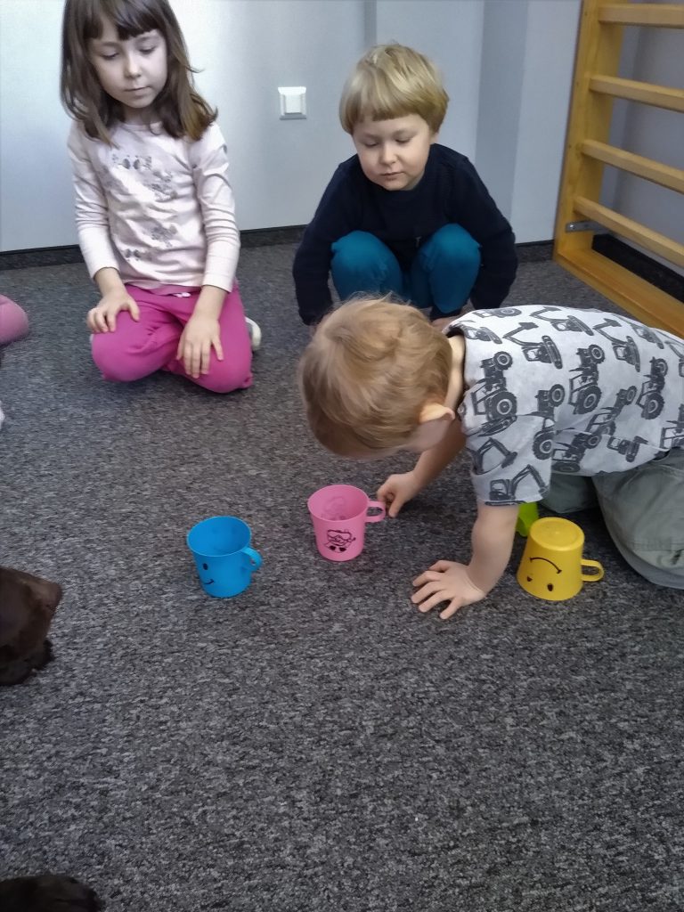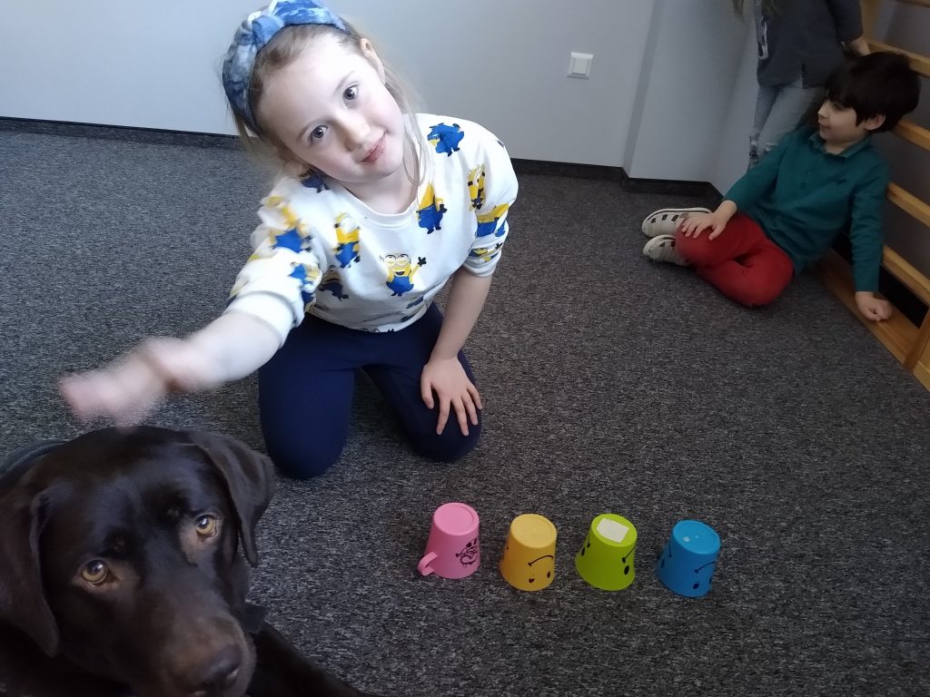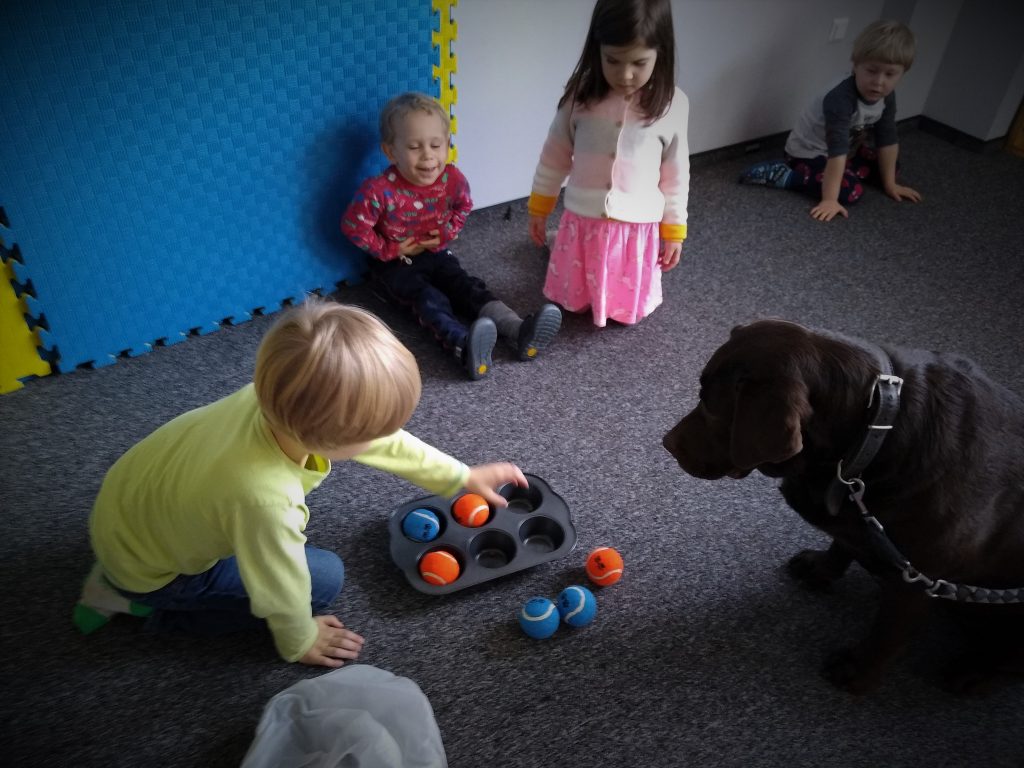 Zabawa polega na chowaniu przez dziecko „smaczków” do foremki i przykryciu ich kolorowymi piłeczkami. Można kombinować z ilością smaczków, ilością piłeczek oraz ich kolorami. Zadaniem psa jest oczywiście wydobycie piłek z foremki i dostanie się do karmy.