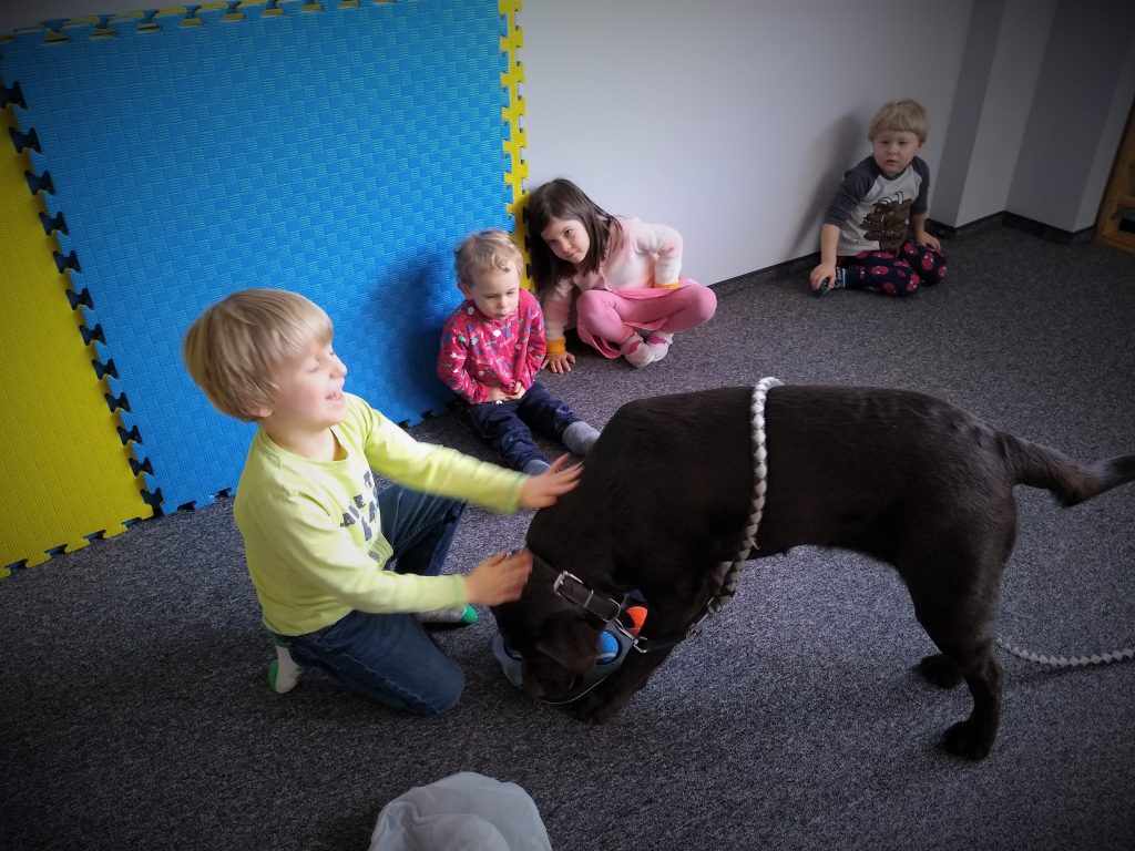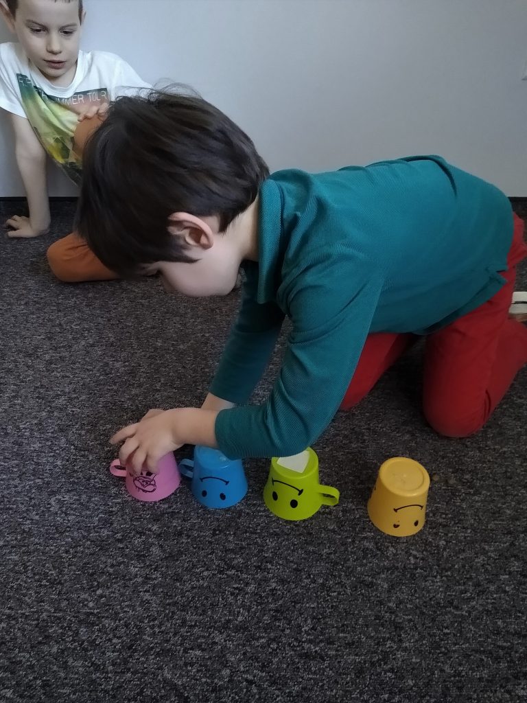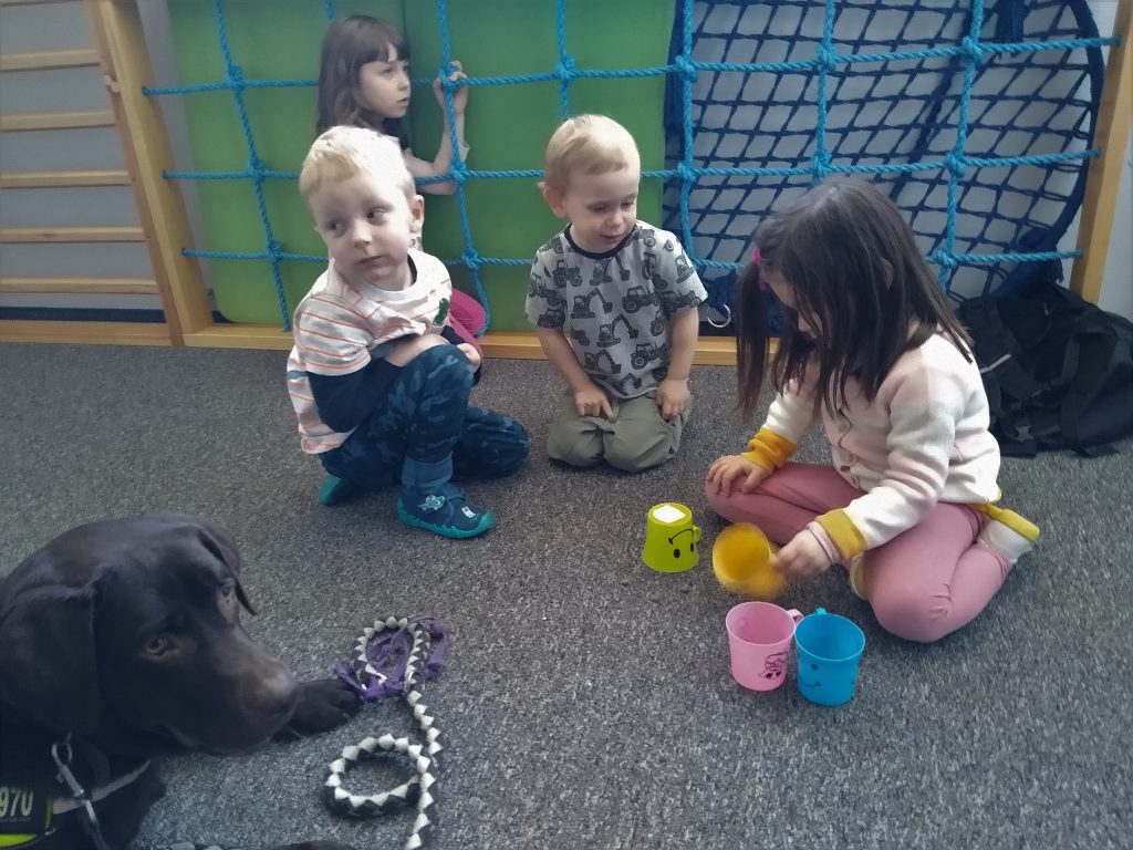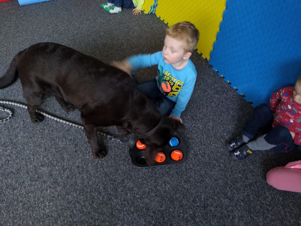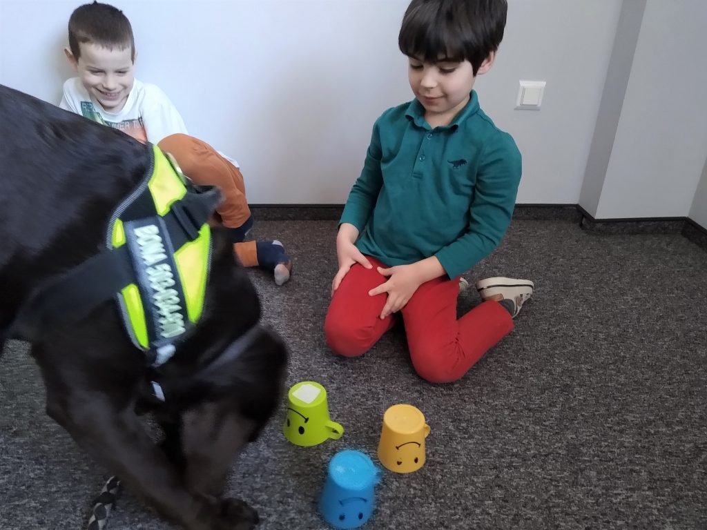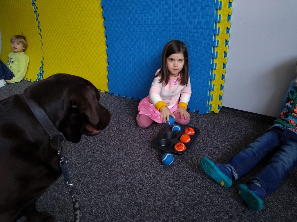 Zabawa polega na chowaniu przez dziecko „smaczków” do foremki i przykryciu ich kolorowymi piłeczkami. Można kombinować z ilością smaczków, ilością piłeczek oraz ich kolorami. Zadaniem psa jest oczywiście wydobycie piłek z foremki i dostanie się do karmy.