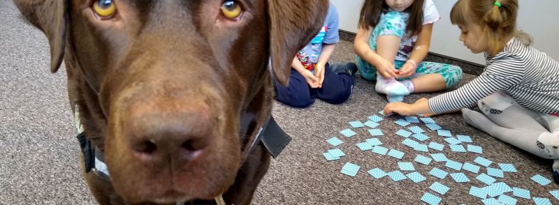 Podczas ostatnich zajęć dzieciaki trenowały spostrzegawczość. Miały za zadanie dopasować rozsypane kartoniki ze zdjęciami do odpowiednich zdjęć na macie “psi album”. Lubimy też układać psie puzzle. Na koniec zajęć – trochę gimnastyki…