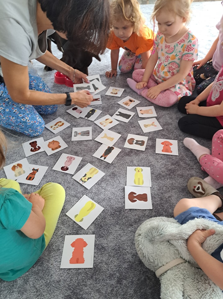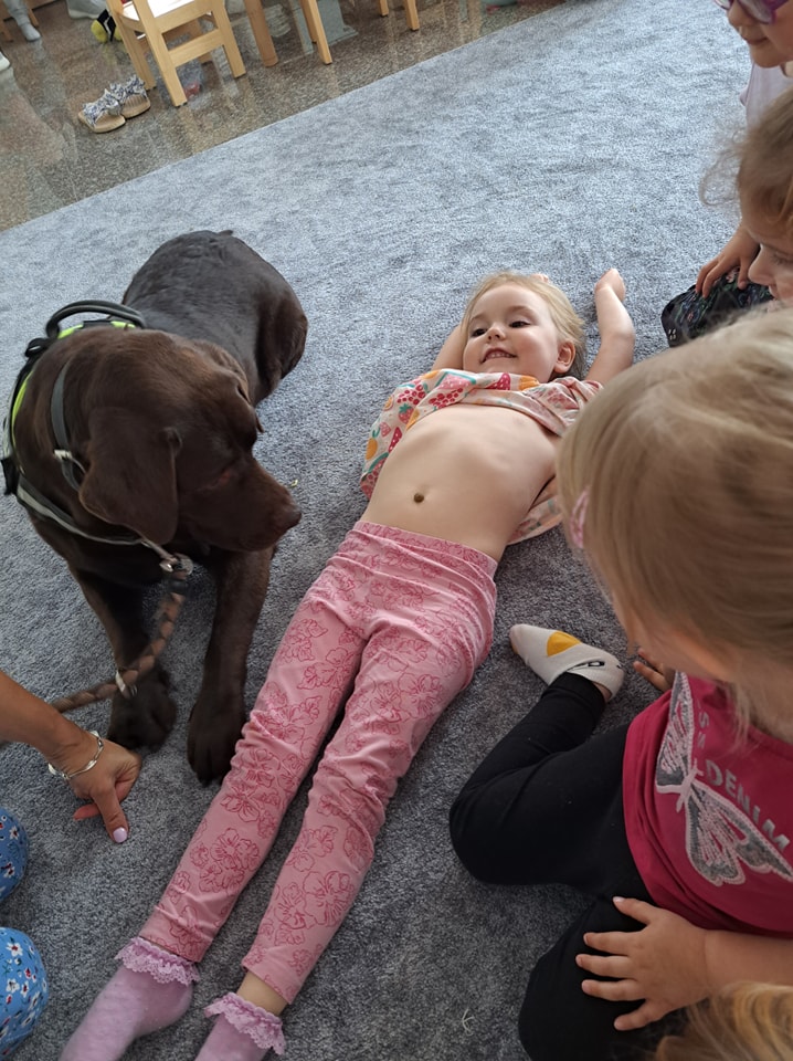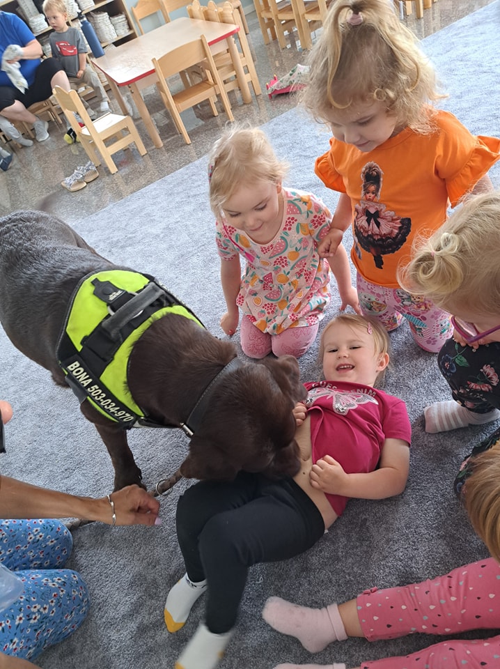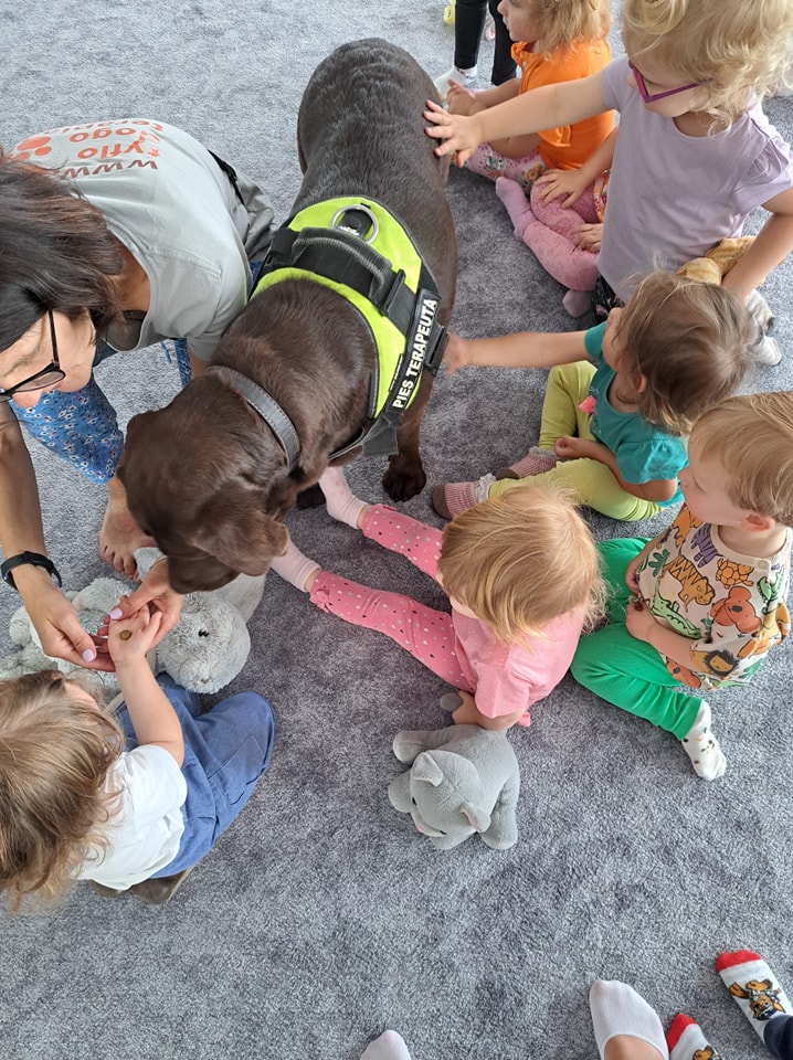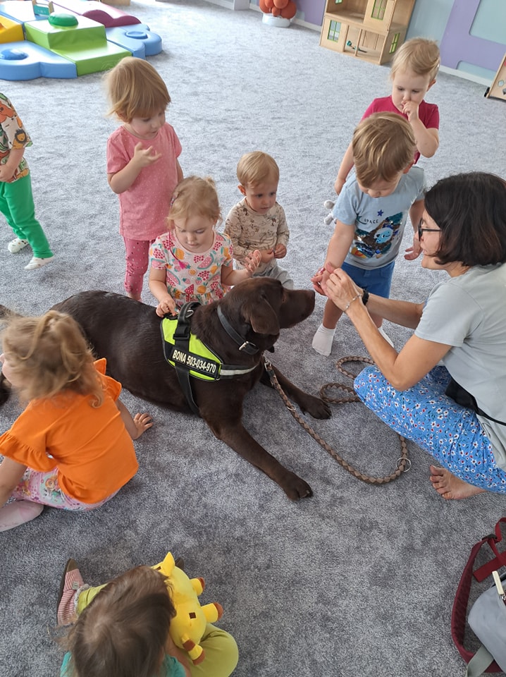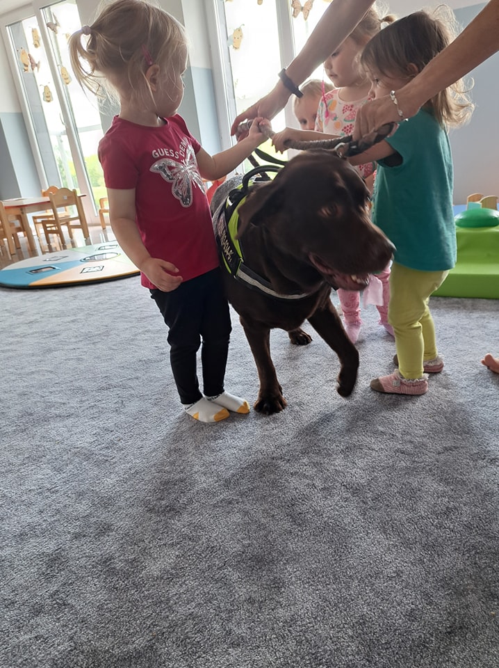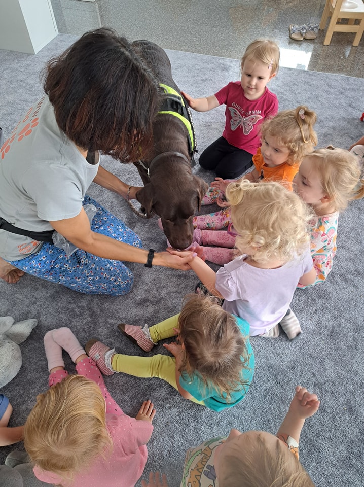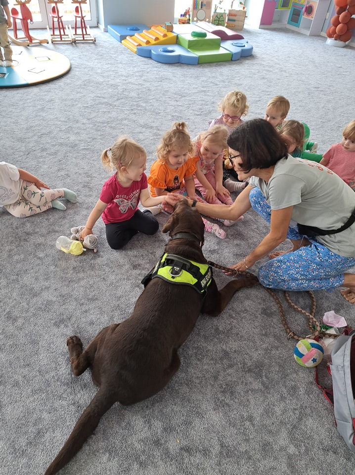 Nasze zajęcia u najmłodszych. Spotkanie s psem zawsze wzbudza spore emocje. Wśród maluszków czasami na początku nieśmiałość a czasem nawet strach. Po oswojeniu się z obecnością czworonoga następuje zaciekawienie i chęć dotyku. A  potem to jest już tylko oczekiwanie na następne spotkania