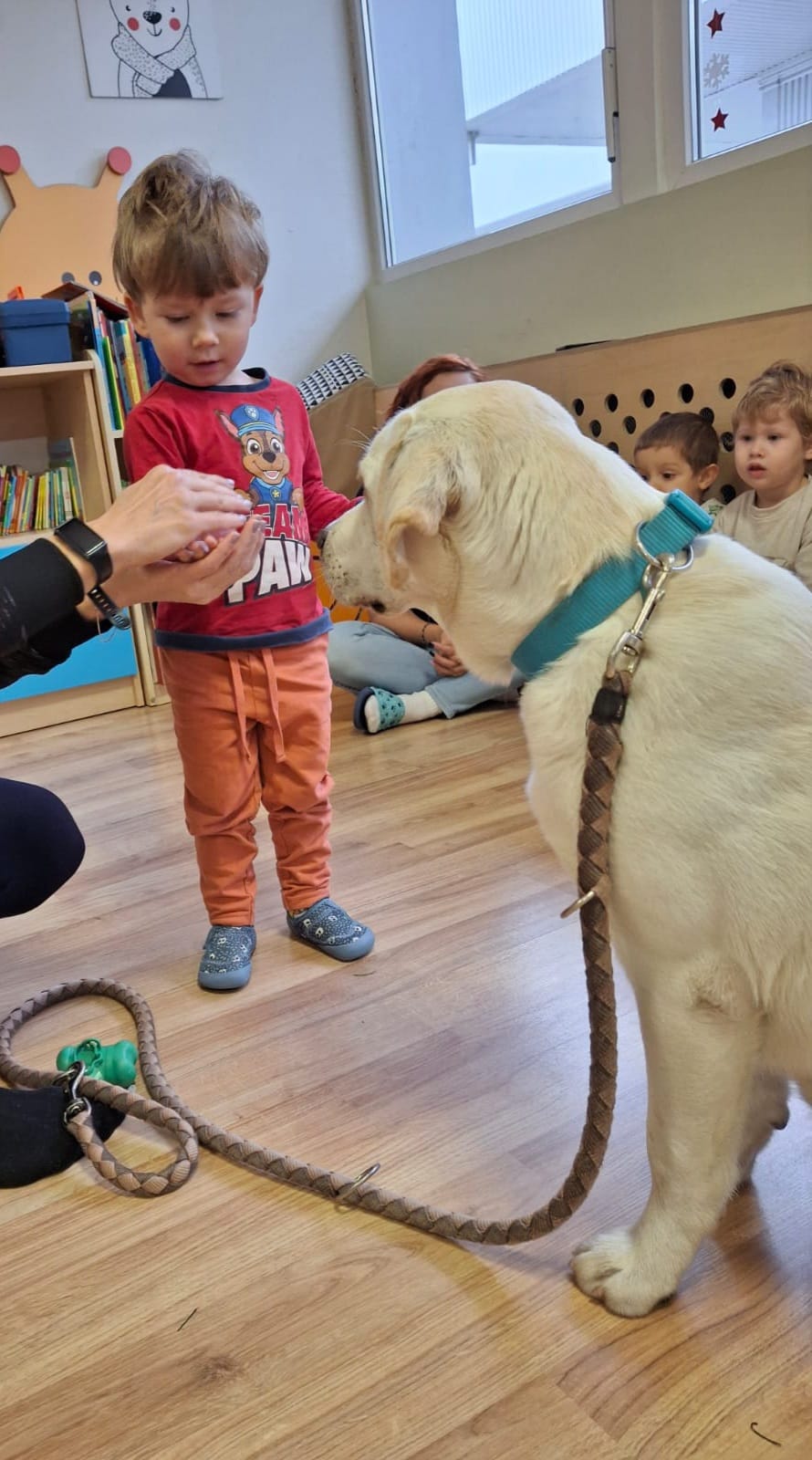 Początki są zawsze trudne, dlatego zaczynamy najpierw od przywitania, karmienia pod kontrolą a potem dzieci “spacerują” z psiakiem 🙂