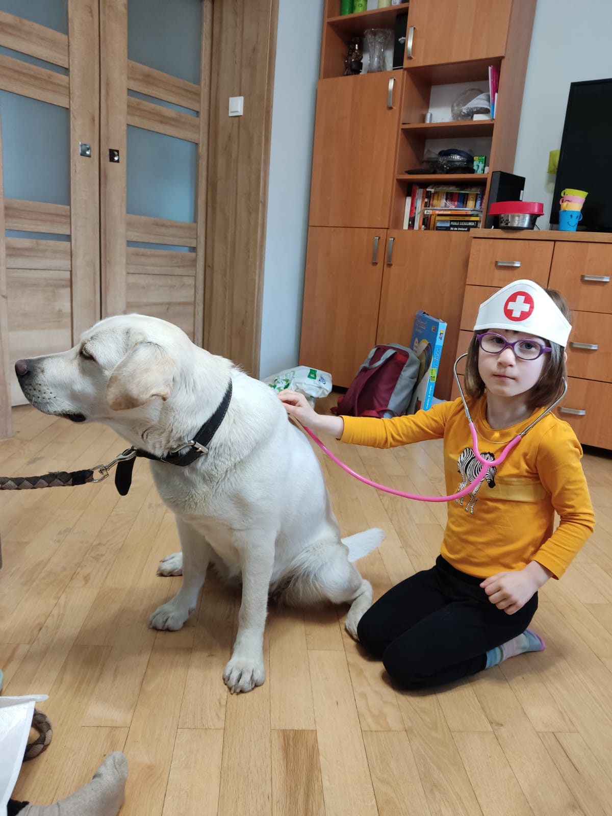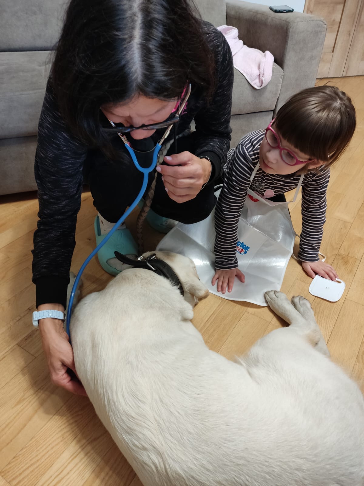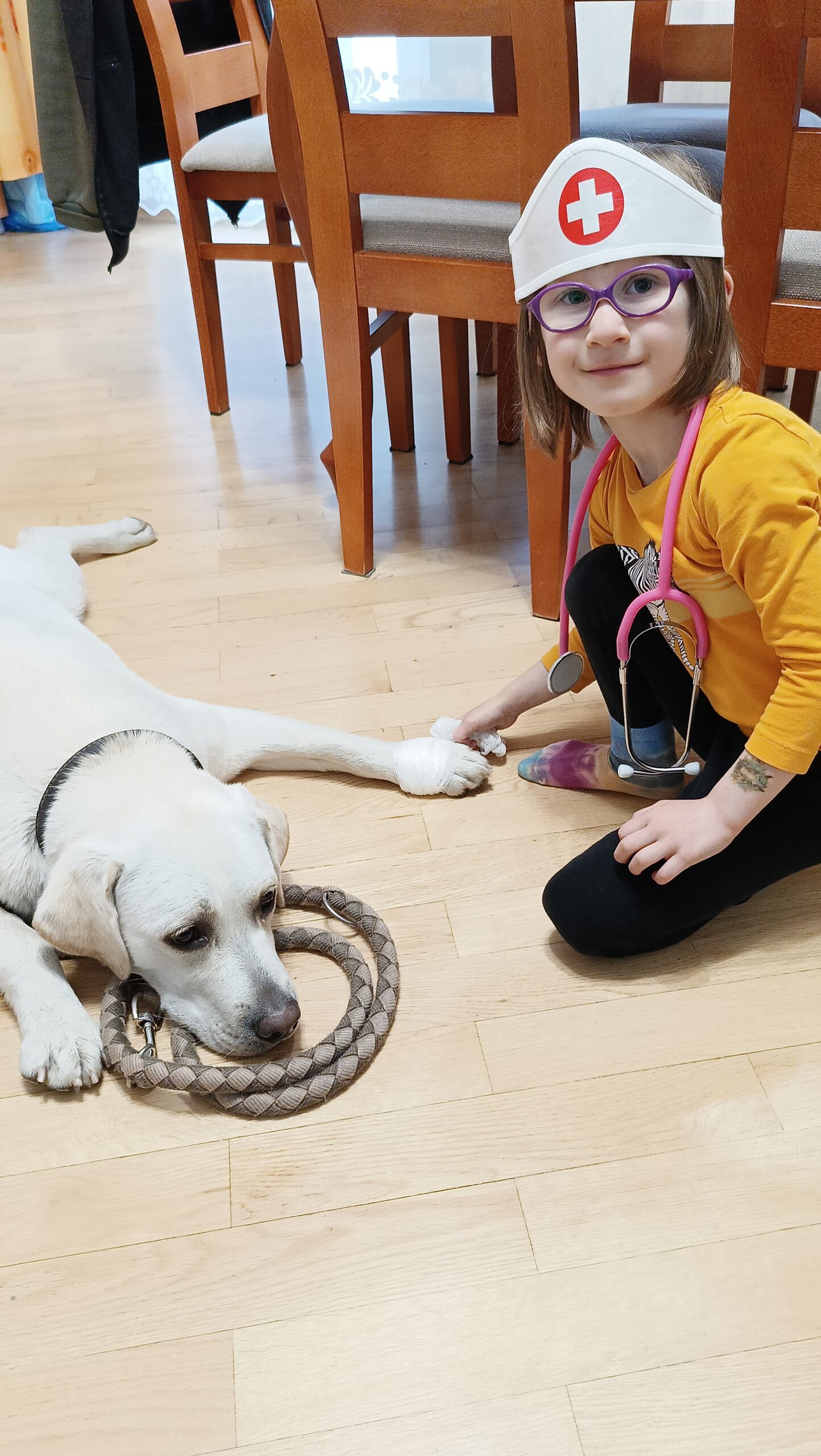 Lekarki przeprowadziły naszej Tokio szereg badań medycznych, takich jak: badanie uszu otoskopem, gardła, zębów, osłuchiwanie stetoskopem. Ponadto, zostałyśmy profesjonalnie obandażowane a Tokio została również zaszczepiona , przy użyciu prawdziwej strzykawki!