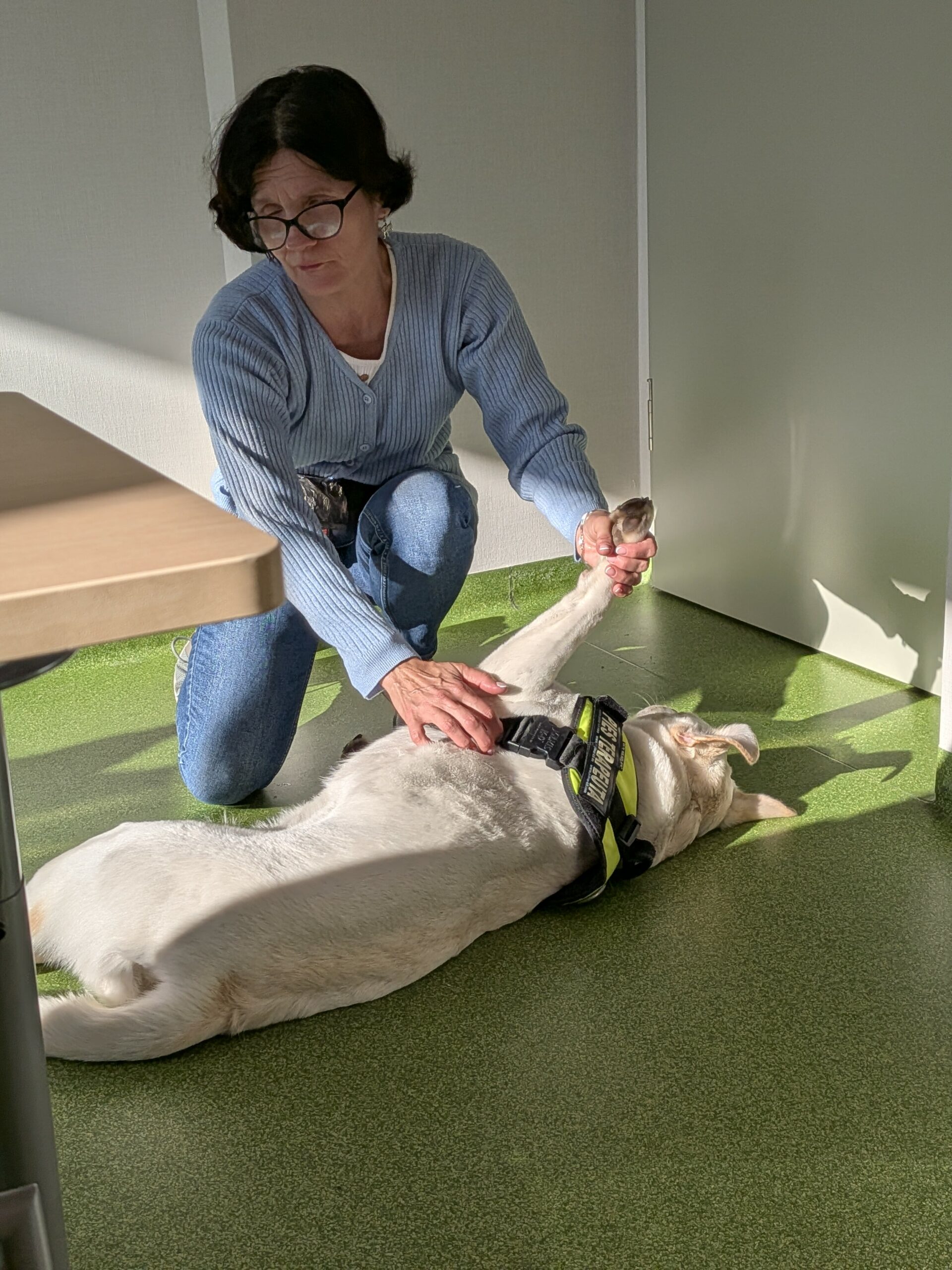 Omówiono wymogi względem dogoterapeuty, jego wykształcenia i umiejętności, aby móc prowadzić terapię z udziałem psa.