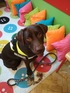 Członek rodziny, partner w trakcie zajęć – pies terapeuta – czekoladowa, rodowodowa suczka rasy labrador retriever. Pies o łagodnym charakterze, kochający ludzi, zwierzęta i pełną miskę ?